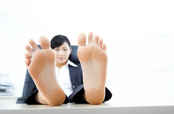 This is a photograph of a young, slender, nude woman with fair skin and long, straight blonde hair. She is seated on a modern, navy blue sofa with her legs spread wide apart, displaying her shaved genitalia and her feet prominently. Her arms support her. Her Soles are visible and she spreads her toes. Her breasts are small, and her nipples are pink. The woman has a youthful, smooth complexion and a gentle smile on her face. She is positioned centrally in the image, with the sofa taking up most of the frame. In the background, the room is bright and airy, with white walls and large windows that allow natural light to flood in. The windows show a glimpse of a green, leafy tree outside. There is a colorful, abstract painting on the wall to the left of the woman, featuring vibrant hues of blue, pink, and orange. The floor is wooden, adding a warm texture to the space. The overall aesthetic of the room is minimalist and modern, with a clean and uncluttered look. The photograph is taken from a low angle, emphasizing the woman's legs, feet and fsoles, which are the focal point of the image. The lighting is soft and natural, highlighting the woman's skin tone and the textures of the sofa and room.