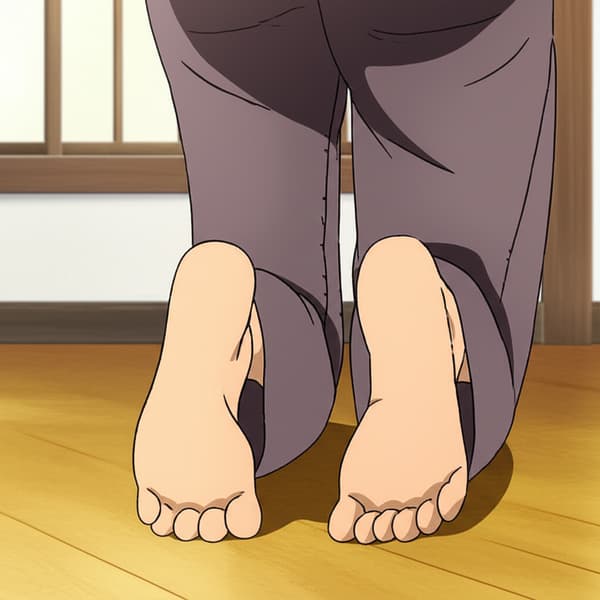 young french woman with black straight hair, laying on their stomach facing away, with their bare feet in the foreground, wearing sleepwear clothes, home, with toerings, with curled toes